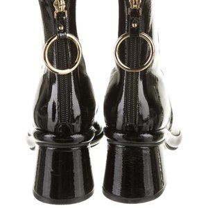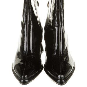 Black patent leather Reike Nen pointed-toe ankle boots with tonal stitching, covered heels and zip closures at shafts. Includes box and dust bag. Very good condition, only been worn twice. Light creasing at uppers; faint creasing at insoles; light residue at soles.