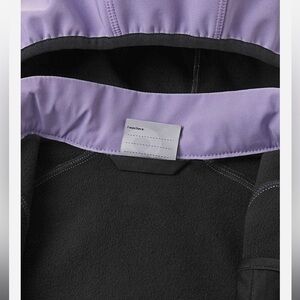 Stylish blue softshell jacket with a hood. Features a front zipper and zippered pocket.