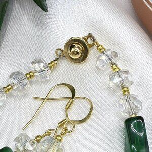 FEATURES: Green glass beads with crystal beads and gold-tone seed beads, snap closure. The earrings have gold-tone stainless steel hooks. See photos for more details.