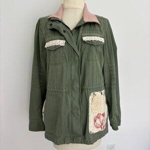 Reimagined upcycled olive embellished anorak. Up-cycled olive army jacket with pink knit collar, lace trimmed pockets, and floral front pocket. Back slit has floral fabric inside of it. Army green, long sleeve, collared, button up, embellished military jacket.