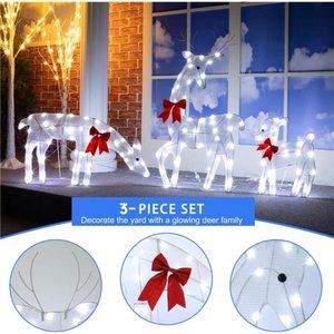 🧿【3 Piece Lighted Deer Set】DEER EATING GRASS: 31.49*16.93 Inch.STANDING DEER: 40.15*20.07 Inch.LITTLE DEER: 16.53*12.2 Inch.Christmas outdoor decorations with 3 lighted deer family, Intricately designed with festive details like decorative bows.