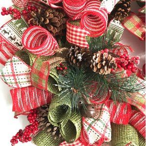 A rustic farmhouse, deco mesh Reindeer Christmas Wreath to adorn your front door or mantle this holiday! Burlap deco mesh Christmas wreath in colors of red, ivory and moss green is loaded with red berries, Florida pinecones, rustic jingle bells, pine spray covered in snow on a wire wreath form to decorate your rustic, farmhouse or mountain home decoration to your entryway or mantle this Christmas season!