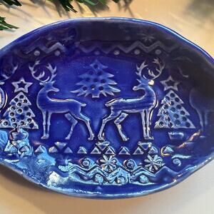 Royal Blue Oval Soap, Trinket, Ring, Ear Ring Ceramic Dish with Reindeer and Spruce Trees