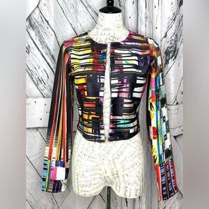 Cropped open front collarless jacket in a bold geometric print.