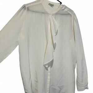 100% Ivory silk blouse with ruffles at the front. Long sleeves with button cuffs. A versatile luxury piece perfect for professional wear or polished casual looks.