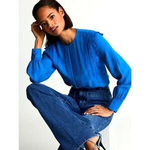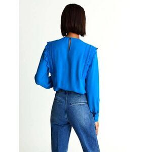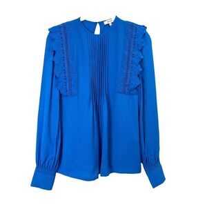 Reiss Bexley Pleated Embroidered ruffle Crepe Blouse Sz 0 blue