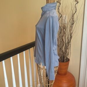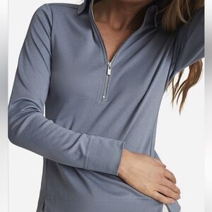 Stylish blue quarter-zip pullover. Perfect for casual wear. 100% cotton. Look measurements also look last photo. There are some very small white spots. Hard to see.