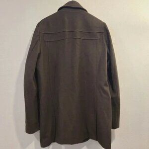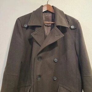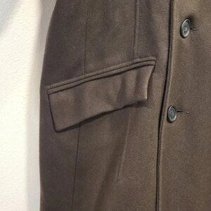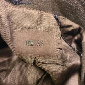 Reiss Brown Double Breasted Brown Wool Coat. This coat is double breasted, has two front flap pockets, buttons at the shoulders, two vents at the back and is fully lined. It is in excellent preowned condition.