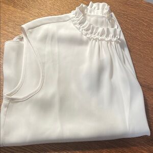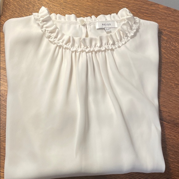 Chic cream blouse with ruffle detail by Reiss. Ideal for versatile styling. Very nice sleeveless blouse ruffle neck single button in back cream size 8