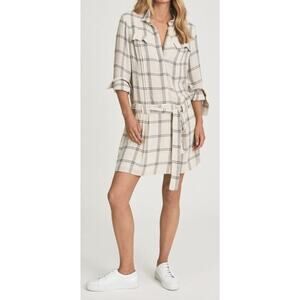 Reiss Dasha Windowpane Plaid Mini Shirt Dress Belted Mock Neck Size 4 White
