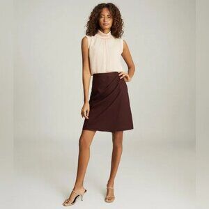 The Reiss Freya skirt in berry is tailored to a pencil silhouette and features a contemporary drape detail to the front panel. This piece is crafted using a wool-blend fabrication. Pair it with a silk blouse and heels for an elegant office look or an evening out!
