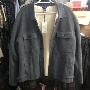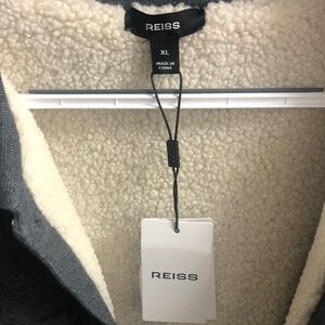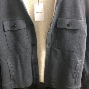 Stylish gray military field jacket by Reiss. Features button closure and front pockets. Perfect for versatile wear.
