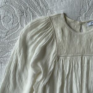 Crafted from a slight-sheer fabrication, this white Marcia blouse embraces intricate detail through the ladder detailing around the neckline and sleeves. It's made to a relaxed shape with a crew neckline and long sleeves for a floaty, feminine look. Team it with flared jeans and heels for a fluid profile that embraces loose lines.