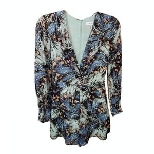 Stylish romper with a vibrant pattern. Features long sleeves and a wrap front. Perfect for any occasion.