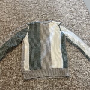 Stylish ribbed sweater with color block design. Features cream, gray, and green tones. Ideal for casual wear.