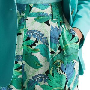 Features: Banded waist, belt loops, Zip fly with hook-and-eye closure, Side slit pockets, back welt pocket, Pleated front, Allover print