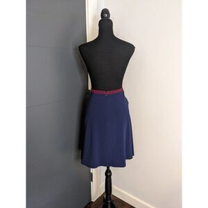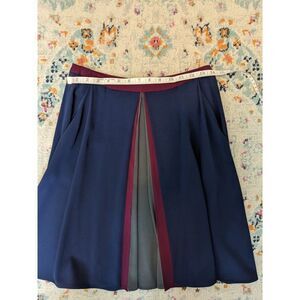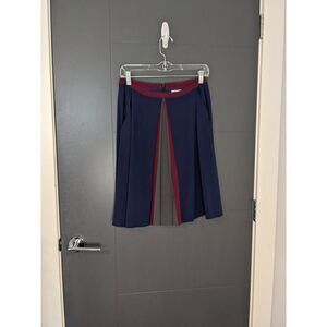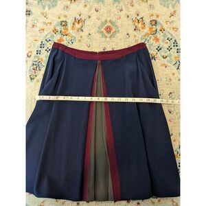 Elegant A-line skirt by Reiss. Features navy and burgundy panels. Perfect for versatile styling.
