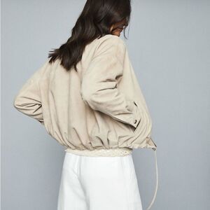 Reiss Solene Suede Bomber Jacket L Cream Tan Leather Zip-Up Designer Outerwear