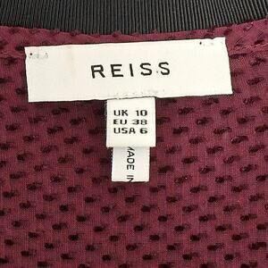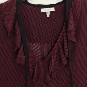 Reiss Swiss dot ruffled v-neckline blouse in women's size 6. Color is called Berry. Black ties at the neck. Viscose/silk blend semi sheer fabric. Semi sheer. Long sleeves have button cuffs. Vented side seams. Gently pre-owned.