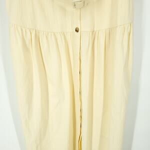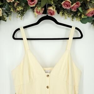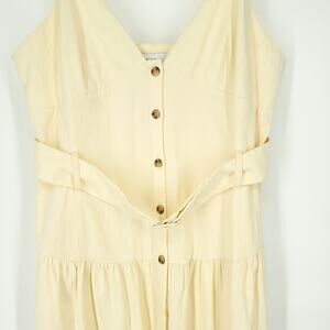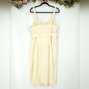 Reiss Vita Button Through Midi Dress in Yellow Per Reiss: "The Vita in yellow is the perfect dress to see you through summer. Cut from a lightweight cotton blend. Buttoning through the front to a V neckline, it's set to be the perfect partner for wedged sandals or barely-there heels. V-neckline. Slim straps. Gather detailing. Slim bodice. Belted waistband. Button-through silhouette. A-line skirt. Midi length. Concealed button at base of straps for a more versatile wear." Size US 12. Condition is New with Tags, visible flaw of dirt on hem as seen in last photo - I did not attempt to wash as it's new with tags.