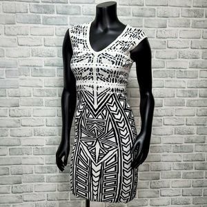 Sleeveless bodycon dress featuring a striking geometric pattern. This dress showcases a V-neckline and a mini length, creating a modern and stylish silhouette. The intricate geometric design in contrasting black and white adds a bold, eye-catching element to the garment. The dress is designed to hug the body, accentuating curves and providing a flattering fit.
