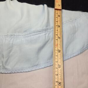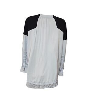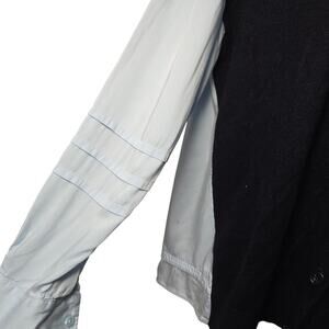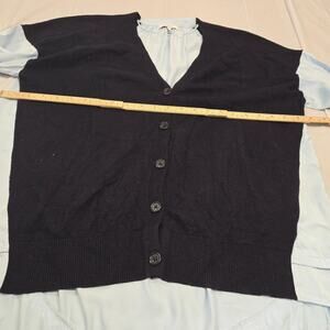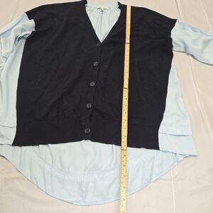 Reiss Womens 6 Addison Mixed Media Cardigan Top Blouse Blue Cashmere Wool Blend. Dark Navy Blue Sweater in front, with Light blue fabric sleeves, back and sides. In good, pre-owned condition with no noted rips, tears or stains. Measurements in description and in pictures with ruler. Please see pictures as they are considered part of the description.
