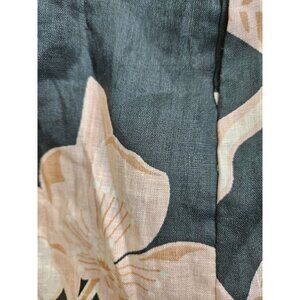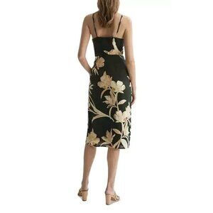 This Reiss dress is a size 2 in a dark green color with a floral tropical design, made of linen material. It features a sleeveless, strappy sleeve style with a V-neckline and zip closure. The midi dress is perfect for various occasions such as weddings, parties, or business events, suitable for summer, fall, and spring seasons. The faux wrap design adds a touch of elegance to this slip dress.