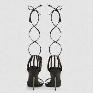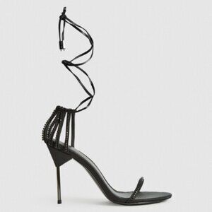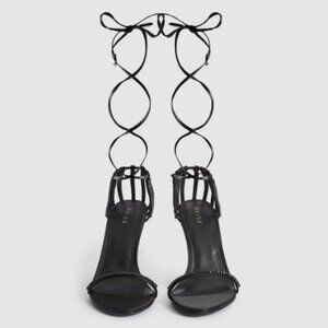 Brand new with tags. The Zhane sandal from Reiss features crystal-embellished wrap straps and a sleek stiletto heel, crafted from 100% calf leather in classic black. A standout piece for evening wear or elevated occasions, combining elegance with modern edge.