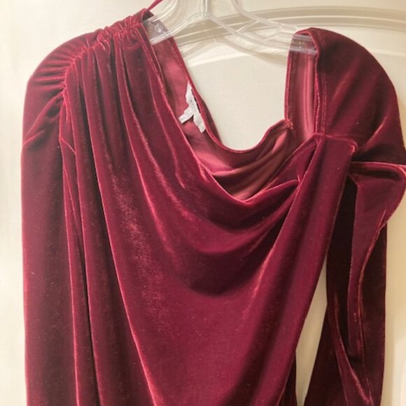 Red velvet for all of your holiday and festive events, size 10 Reiss, hugs in all the right places with one shoulder and thigh slit. Very flattering!