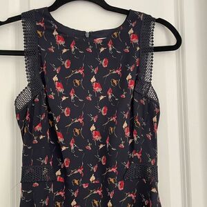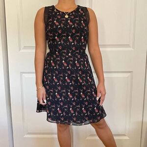 Description: mini black floral dress, fit and flare, pink floral print, sleeveless with lace trim design, lined, crew neck
