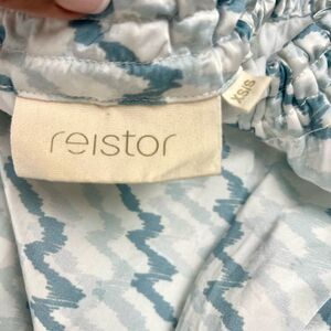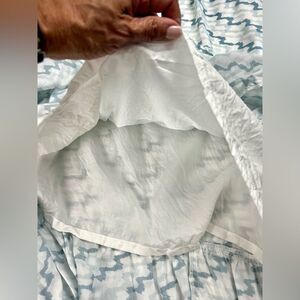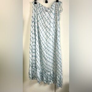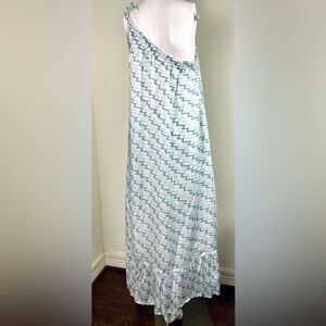 Gently worn Reistor dancing in the Moonlight Maxi dress. Step out in style with this elegant white and blue dress. Perfect for any occasion, this dress offers a chic and comfortable fit. A one shoulder dress with a drawstring neckline, this flowy, breezy silhouette. See photos for measurements.