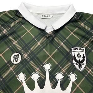Green plaid football jersey featuring white collar detail, crown logo print, and embroidered Relab crest on chest. Excellent condition.