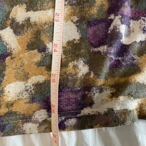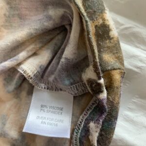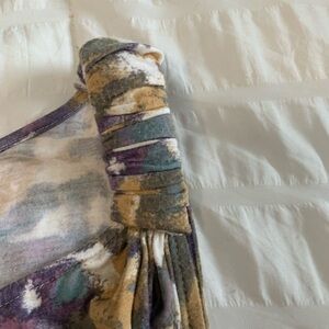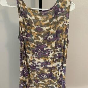 Relativity abstract tank. Size large tank is 93% viscose and 7% spandex. Unique tank has two different shoulder styles. The colors in the tank are gold, purple, brown and green.