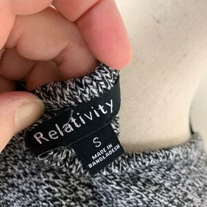 Relativity Black/White Fringe Batwing Boho Sweater Sz S. Great cozy boho sweater with bat wing short sleeves and fringe. Great for work with a statement necklace and black pants or for kicking back with friends with jeans and booties. The fringe has become a little looser with washing, but I like the effect. You can trim it if you are looking for a cleaner look. Cozy Relativity black and white fringed boho sweater Sz S.