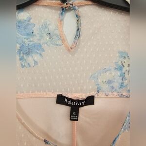 Beautiful soft pink and blue Relativity two-layered ruffled blouse. Fully-lined with key hole detail on back. Size XL.