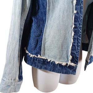This denim jacket hums with color and craft, a tapestry of hand-beaded florals stitched across sun-washed panels of light and dark indigo. The raw-edge seams and open front give it a laid-back, effortless vibe, while the intricate beadwork makes it feel one-of-a-kind and collected from somewhere far away.