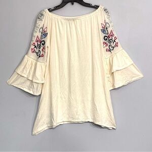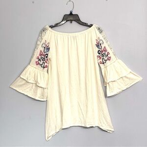 Relativity | Women’s Cream Bell Sleeve Tunic Boho Embroidery and Lace Bl…