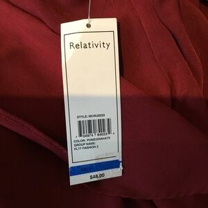 Tulip front from relativity NWT color is called pomegranate v neck with scoop neck overlay makes for a keyhole front look approximate pit to pit 22 shoulder to hem 27