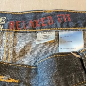 These relaxed blue jeans offer a comfortable fit with a classic denim look, featuring a slightly faded finish for a worn-in style. The contrast stitching adds a touch of traditional charm, making them perfect for everyday wear.