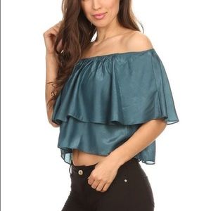 with off the shoulder sleeves and ruffled detailing.