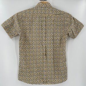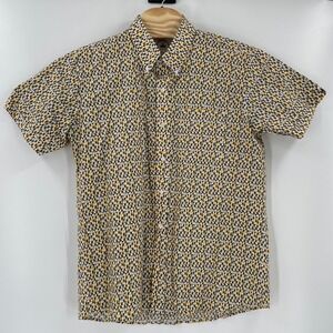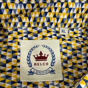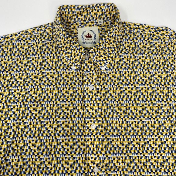 This is a pre owned Relco London XL Yellow Blue Triangle Pattern Short Sleeve Cotton Button Up Shirt. This item is in excellent condition with minimal or no signs of use.