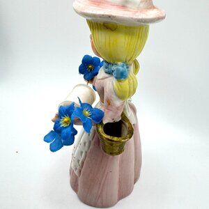 A charming hand-painted vintage figurine featuring a sewing girl with a pin cushion hat and spool of thread. Ideal for collectors or sewing enthusiasts.