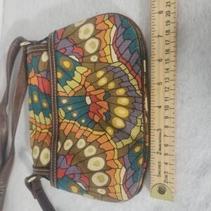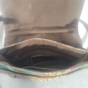 The Relic Boho Canvas Crossbody Purse is a small handbag with a unique butterfly wing pattern, perfect for hippie-inspired outfits. Made from faux leather and canvas, this purse features a magnetic closure, double brown handles, and gold hardware accents. The bag is lined, has inner pockets, and is designed for travel and casual occasions. Its multicolor exterior and brown lining add a touch of bohemian flair to your outfit, making it a stylish and functional accessory for women on the go.