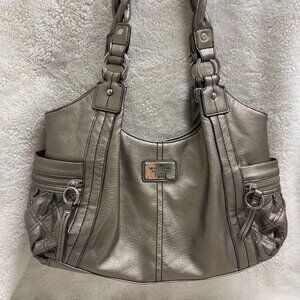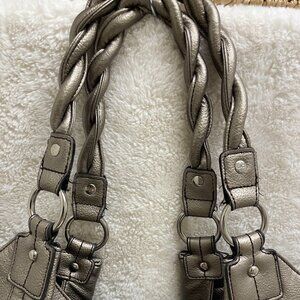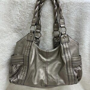 Large Relic Brand Collection slouchy, shoulder bag. Metallic pewter color with big chunky silver hardware, braided top handles and accent stitching. Great bold look for a stylish way to tote all your necessities around. Very roomy, snap closure, 3 inside compartments and zipper pouch. Outside the bag has pouches on each side for easy access as well as zippered compartments for a little added security. Lots of nice detailing.