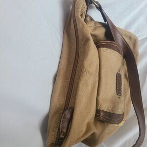 Relic Brown Boho Shoulder Bag Sydney hobo khaki Measures 13x13 strap drop 12 in The Relic brand brown boho shoulder bag, Sydney Hobo style. It features a canvas body with faux leather accents and a patterned fabric detail. The bag has a flap pocket on the front and a single adjustable shoulder strap. This style of bag, known as a hobo bag, is characterized by its crescent shape and slouchy silhouette. Brown bags are considered versatile and timeless accessories.