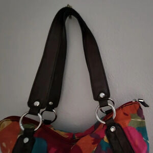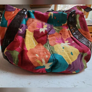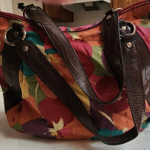 Lovely colorful floral Relic crescent shaped handbag.