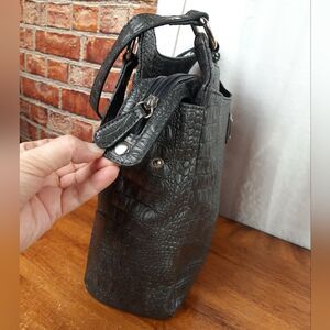 This is a gorgeous crocodile shoulder bag by Relic made by Fossil that is in like new condition inside and out. This bag features a gorgeous crocodile design, a full-size slip pocket on the back, a full-size snap closure pocket on the front, and beautiful silver tone hardware throughout. The inside features three compartments with the middle being a zipper compartment and includes two slip pockets and a zipper pocket. It is a simple black fabric lining that is spotless. The main zipper snaps down on each side. This bag is edgy and trendy and would be perfect for a night out paired with your favorite heels or boots.