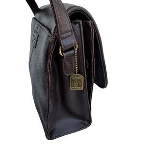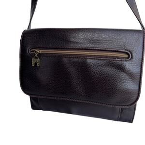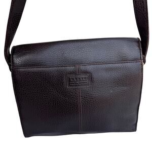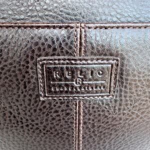 This Relic crossbody bag is in very good pre-owned condition, showing some minor wear as pictured, which is typical for a well-loved leather item. Crafted from a rich, dark brown pebbled leather, this versatile bag features a secure flap closure.