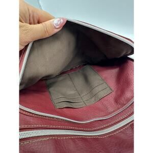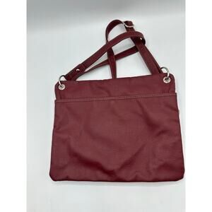 Elegant Relic Erica Crossbody Bag in rich burgundy. Crafted from faux leather with a smooth finish, it features multiple zippered compartments and an adjustable crossbody strap. Measures approximately 9”H x 11”W x 2.5”D with a 24.5” adjustable strap drop. Good Used Condition. Please review photos for condition details.