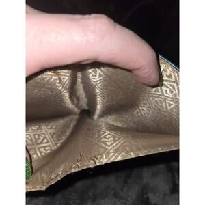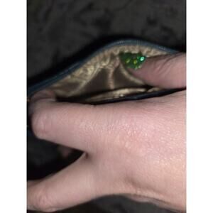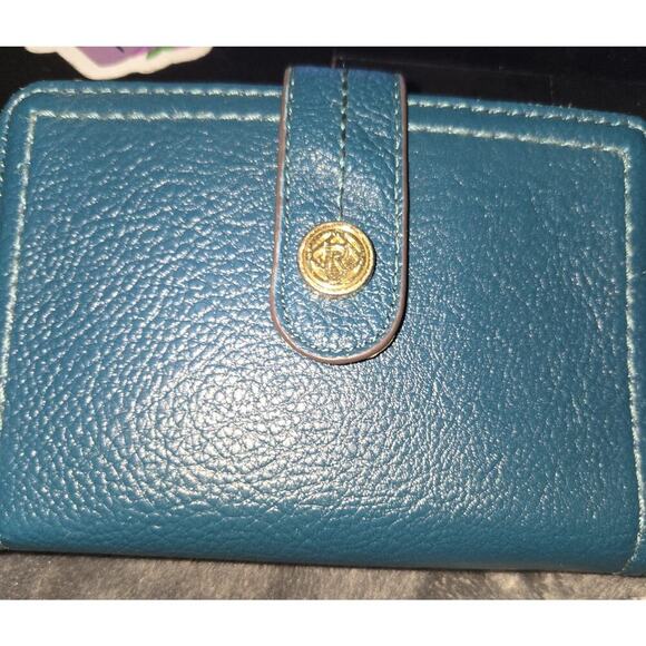 there is a few marks on the inside, see photos, is a teal Relic wallet for women, featuring a zip-around style with credit card slots and a folding design. Made of faux leather, it has a coin compartment, ID slot, and measures 5.5" in length and 4" in width. Accented with a zipper, this small wallet is practical and stylish for everyday use.